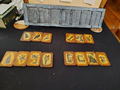 There are 14 streched pieces of leather in wooden frames with images drawn on both sides.